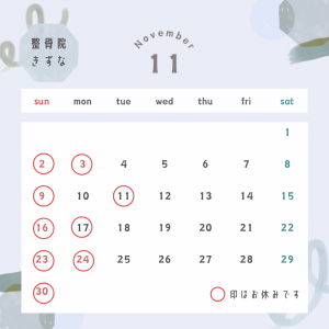 Blog記事一覧 > > 令和7年 11月の受付について 令和7年 11月の受付について 2025.10.25 | Category: 【令和7年11月の受付について】 定休日:日曜日・火曜日・祝日 お休み:17日(月) ※18日(火)と25日(火)は特別に営業しております!