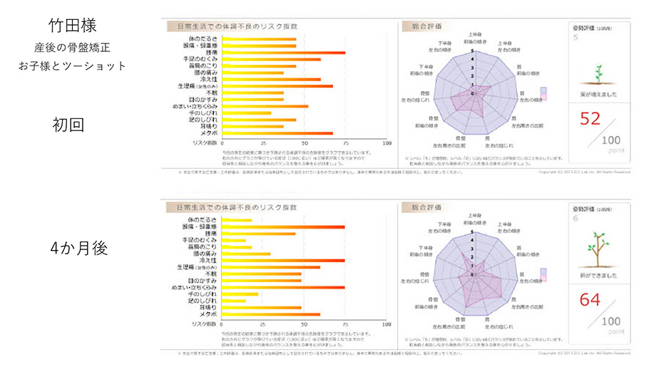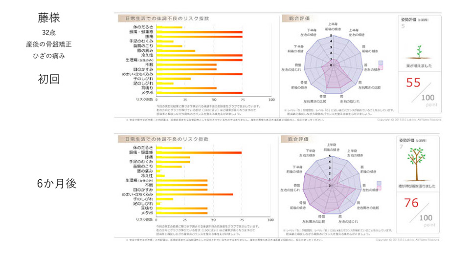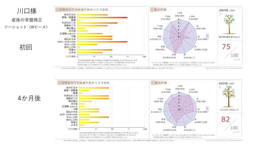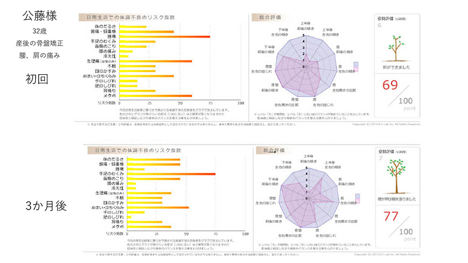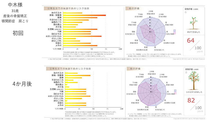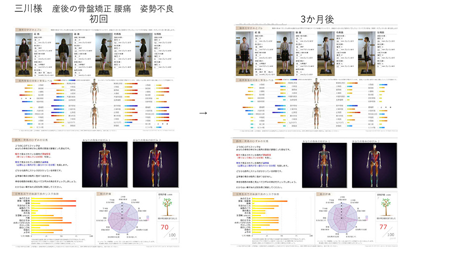 産後の骨盤のゆがみが気になり、知り合いの紹介でこちらにお世話になりました。元々腰痛もあり、カウンセリングで現在の症状はもちろん、生活背景など様々な視点から診察してもらいました。悩みも多く不安でしたが、通っていくうちに少しずつ症状が改善されて、前向きな気持ちになりました。検査も定期的にあるので、今までのものと比較ができてとてもよかったです。