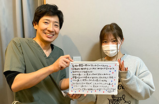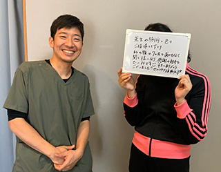 先生の施術と色々ご指導して下さり、私の顎は7ヶ月で痛みもなく開くようになり、感謝の気持ちで一杯です。本当にありがとうございました!!セルフケア頑張ります。