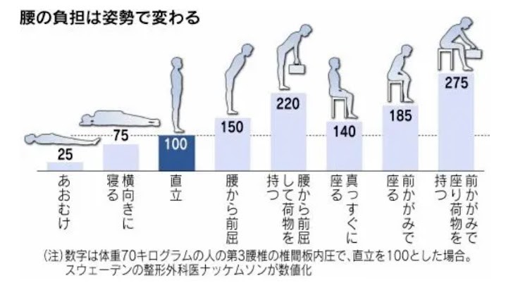 そして、体にかかる負荷は、その際の姿勢により大きく異なります。